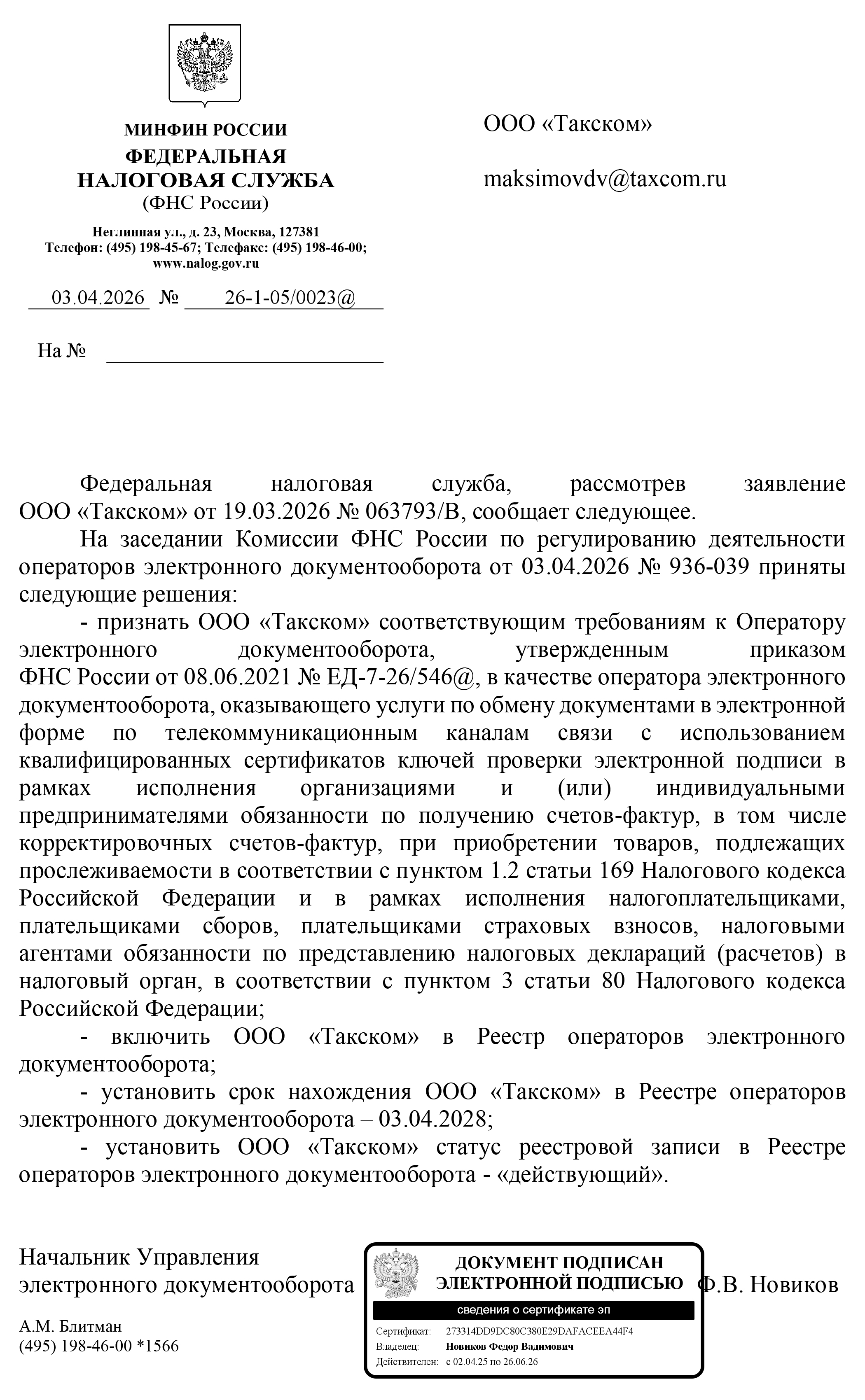ФНС России подтвердила соответствие «Такском» требованиям к операторам электронного документооборота и продлила статус действующего оператора ЭДО до 3 апреля 2028 года. Решение принято по итогам заседания профильной комиссии от 3 апреля 2026 года № 936-039.
