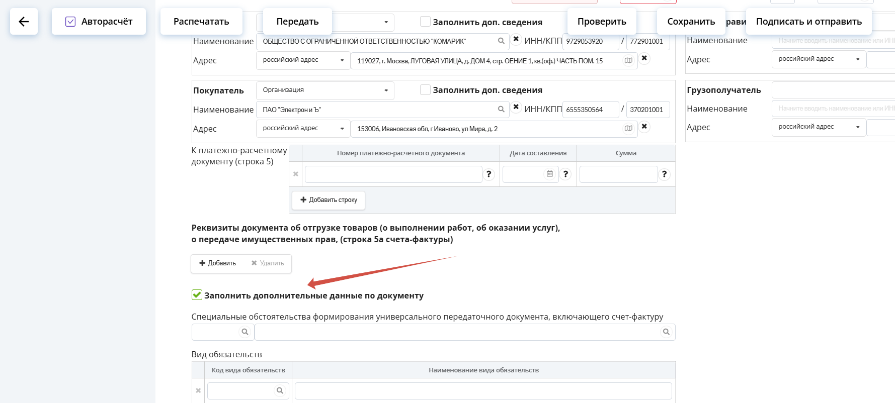 Отметить галочкой «Заполнить дополнительные данные по документу».