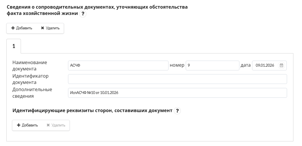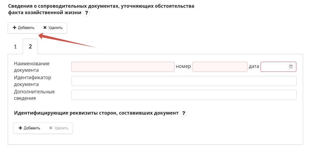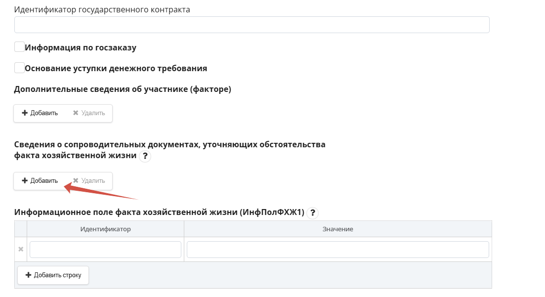 В открывшемся дополнительном окне найти заголовок «Сведения о сопроводительных документах, уточняющих обстоятельства факта хозяйственной жизни» и нажать кнопку «Добавить».