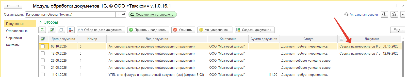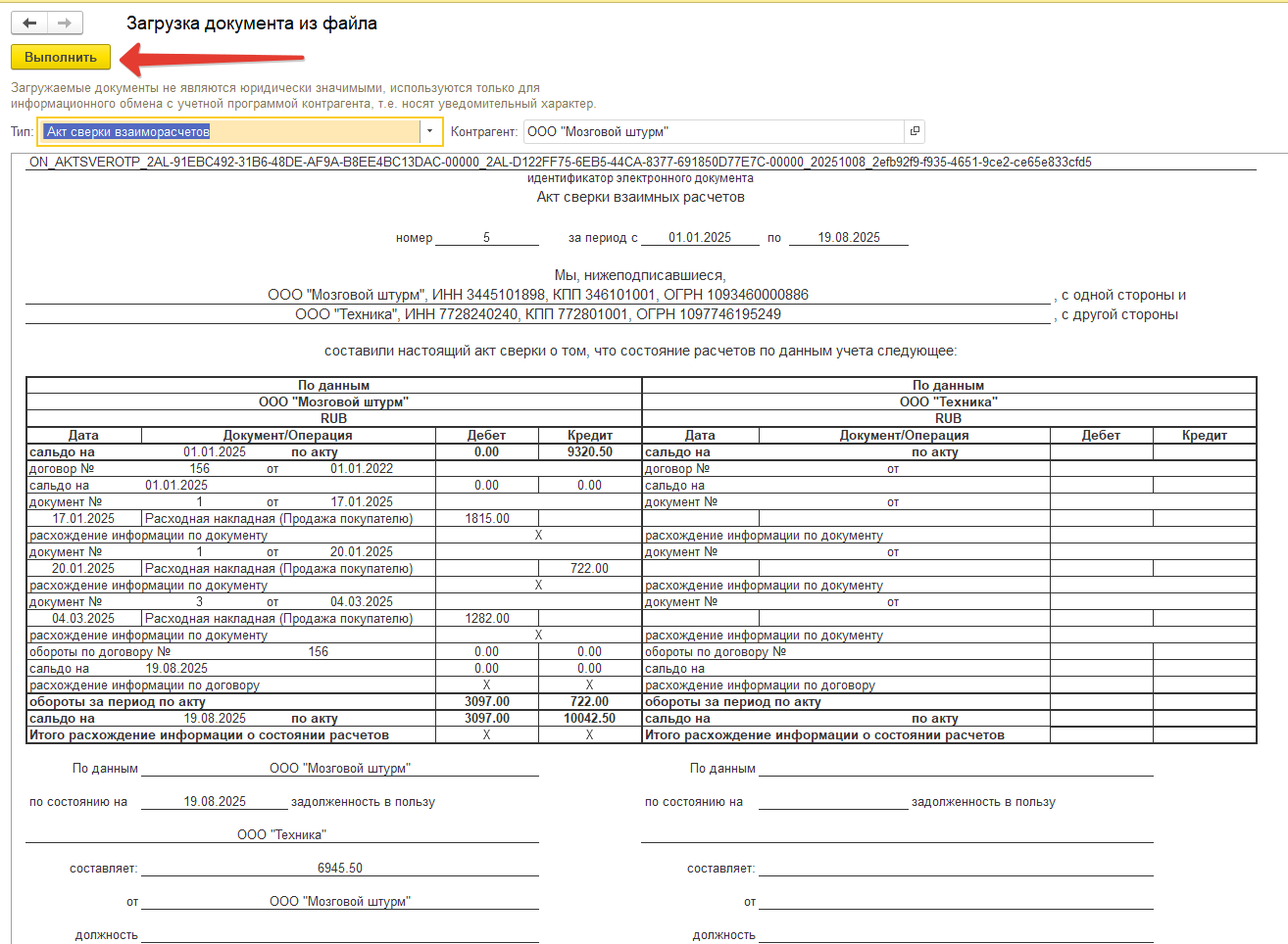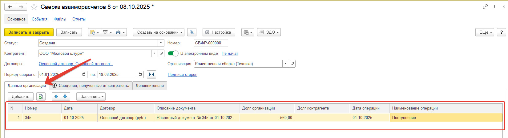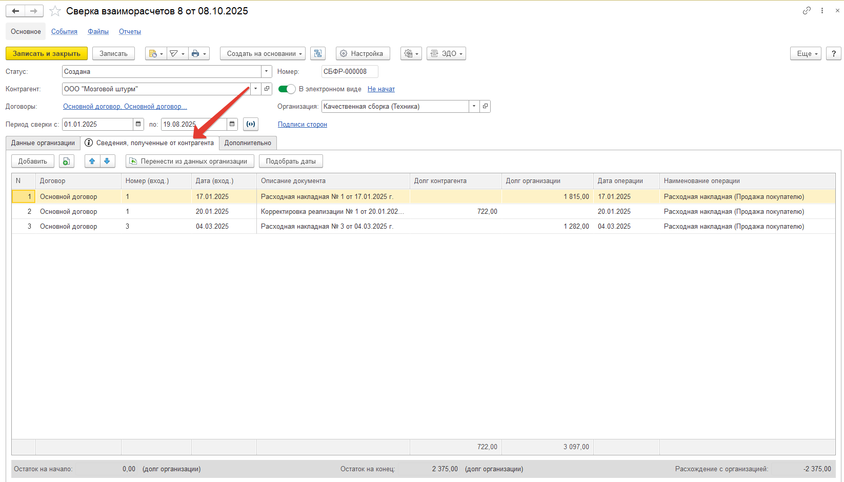 После нажатия «Отправить» в информационной базе 1С (ИБ) создастся заполненный документ «Сверка взаиморасчетов». Информация на вкладке «Сведения, полученные от контрагента» заполняется на основании «Титула отправителя».
