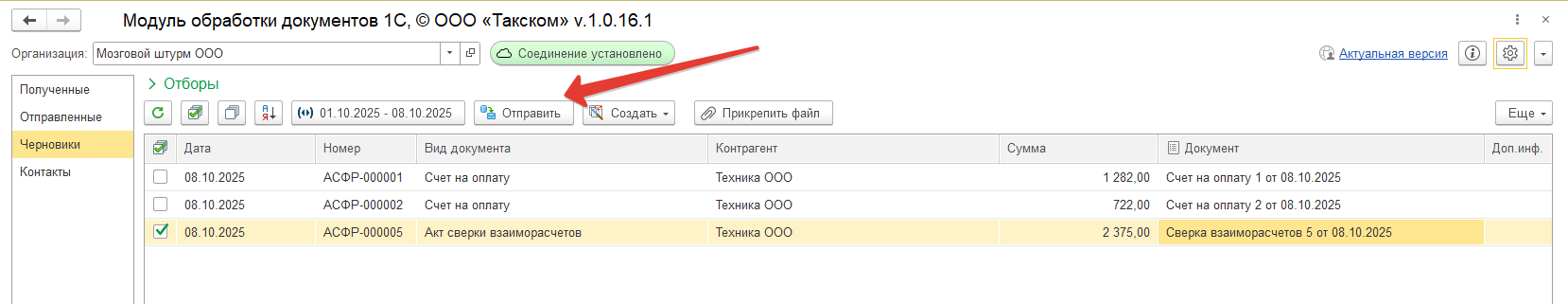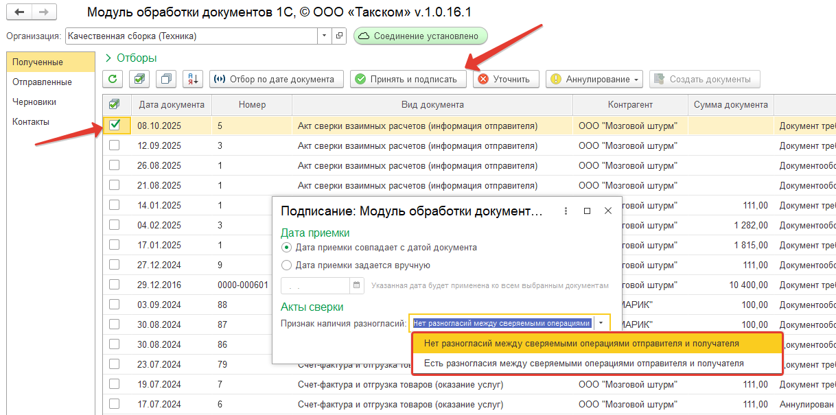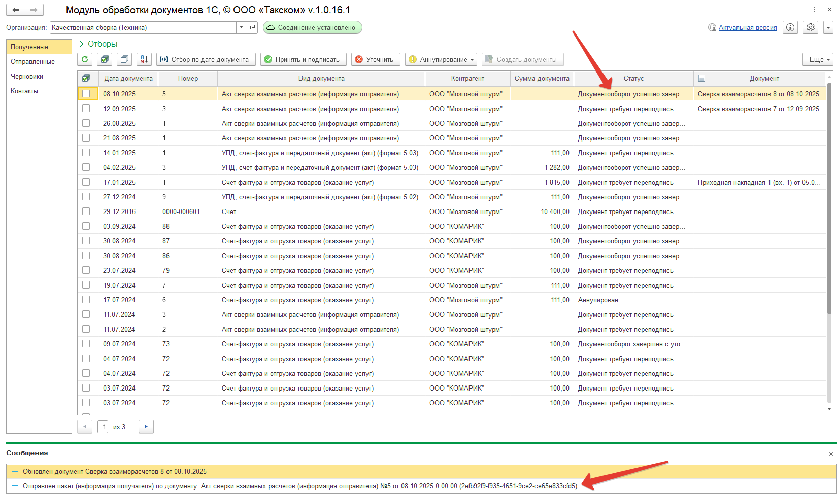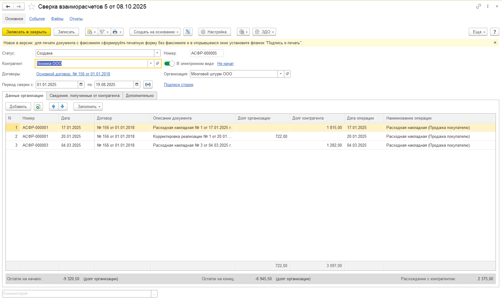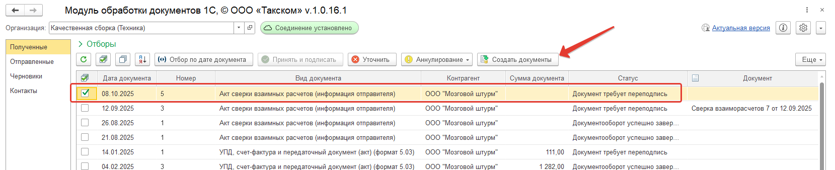 После нажатия «Отправить» в информационной базе 1С (ИБ) создастся заполненный документ «Сверка взаиморасчетов». Информация на вкладке «Сведения, полученные от контрагента» заполняется на основании «Титула отправителя».