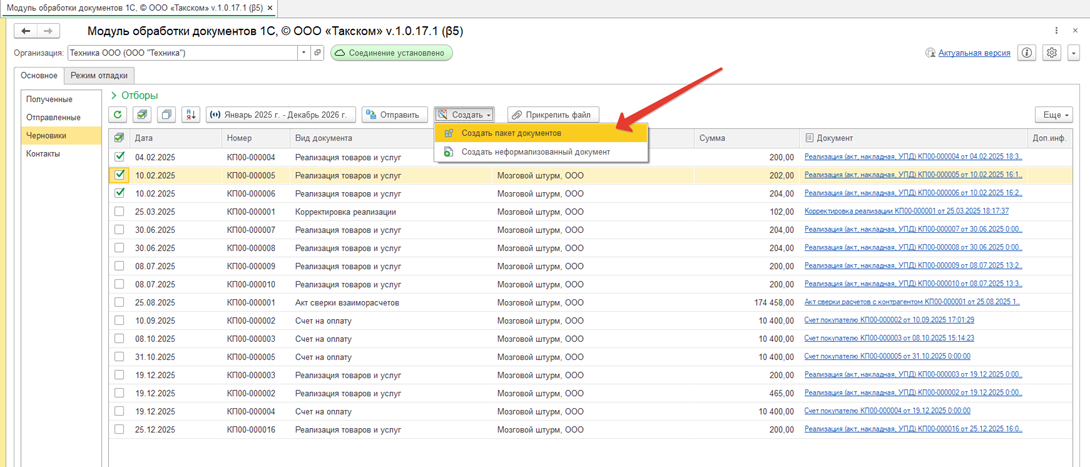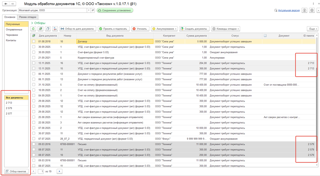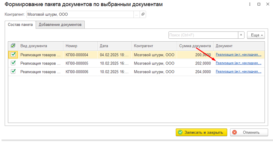 У пакета документов в столбце «Вид документов» будет указано «Пакет документов».