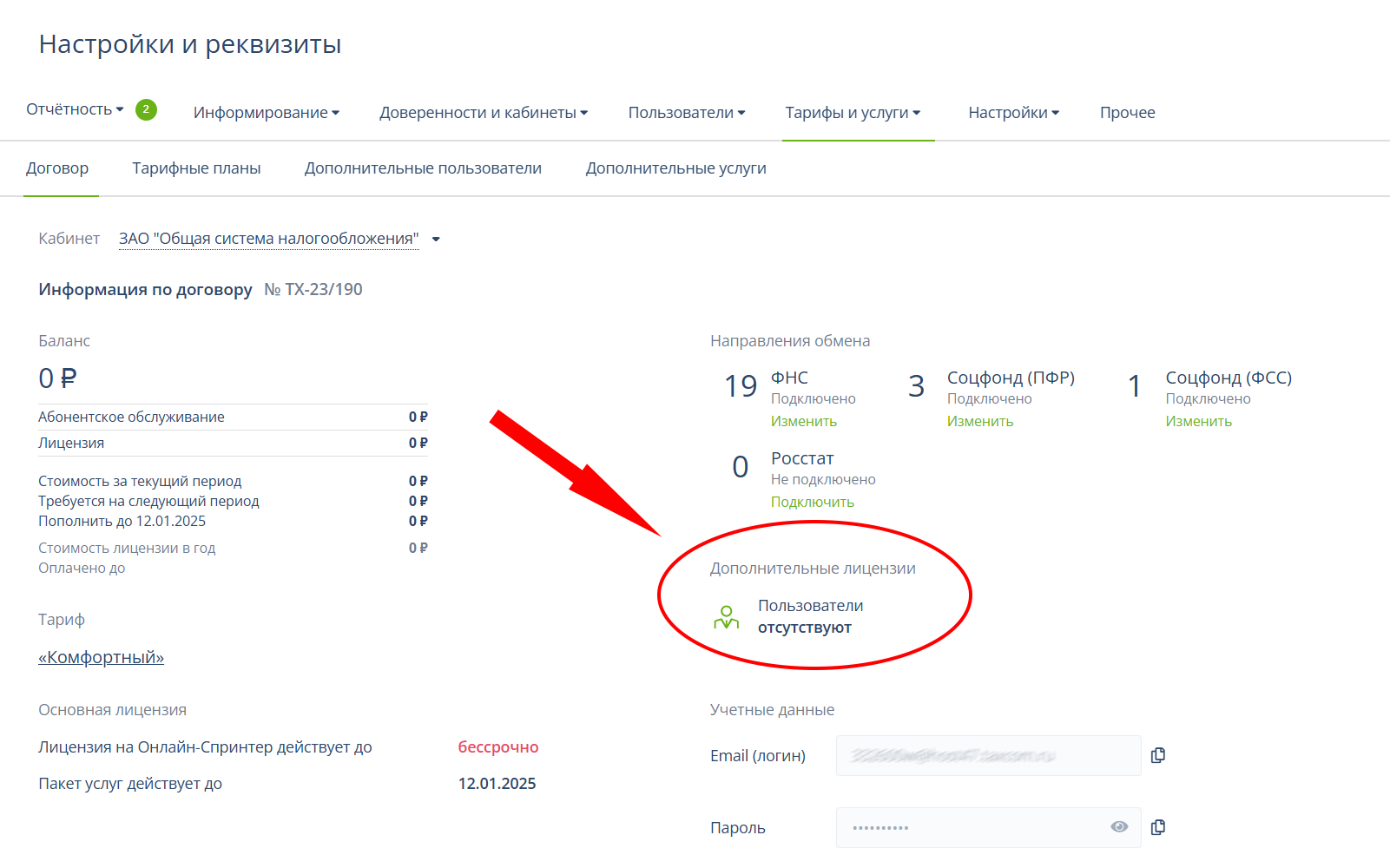 На вкладке «Тарифы и услуги» - «Договор» и «Дополнительные лицензии»: