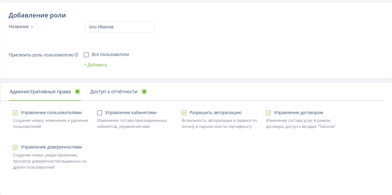 В открывшемся профиле сотрудника установите необходимые права на вкладках «Административные права» и «Доступ к отчётности».