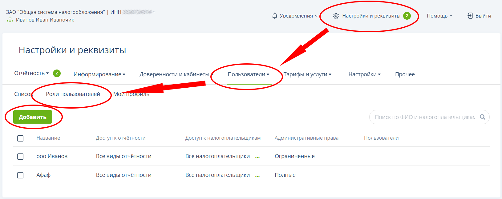 Выберите вкладку «Настройки и реквизиты» - «Пользователи» - «Роли пользователей».