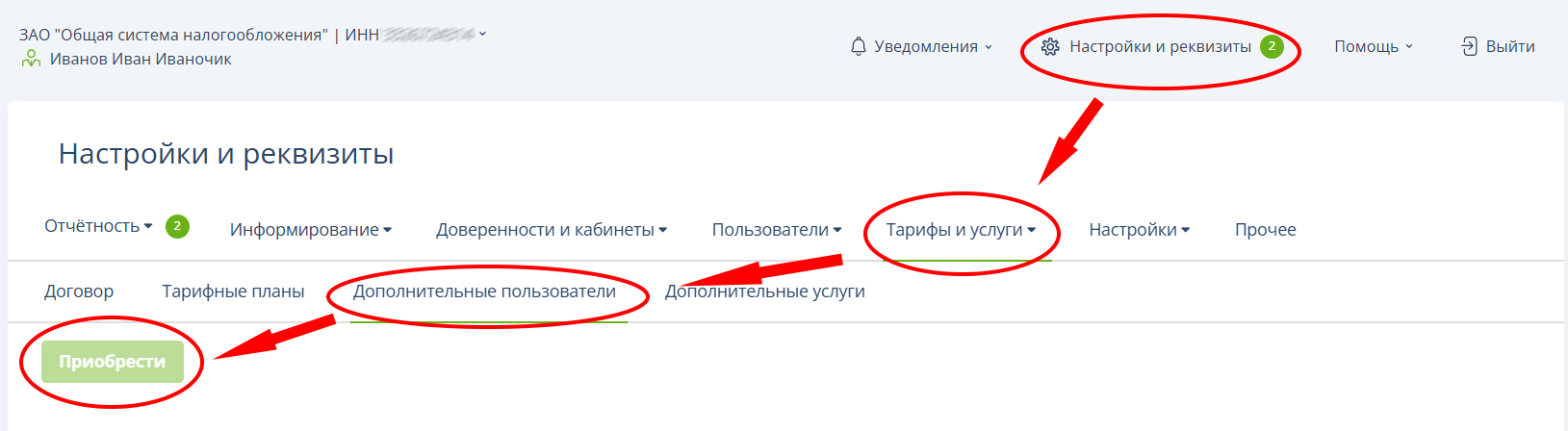 Выберите вкладку «Настройки и реквизиты» - «Тарифы и услуги» - «Дополнительные пользователи», нажмите «Приобрести».
