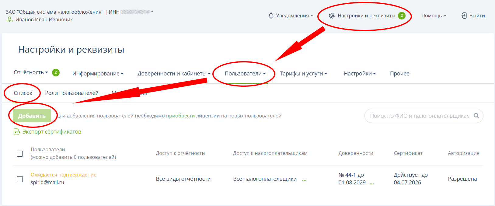 Зайдите в раздел «Настройки и реквизиты» - «Пользователи» - «Список» и нажмите «Добавить».